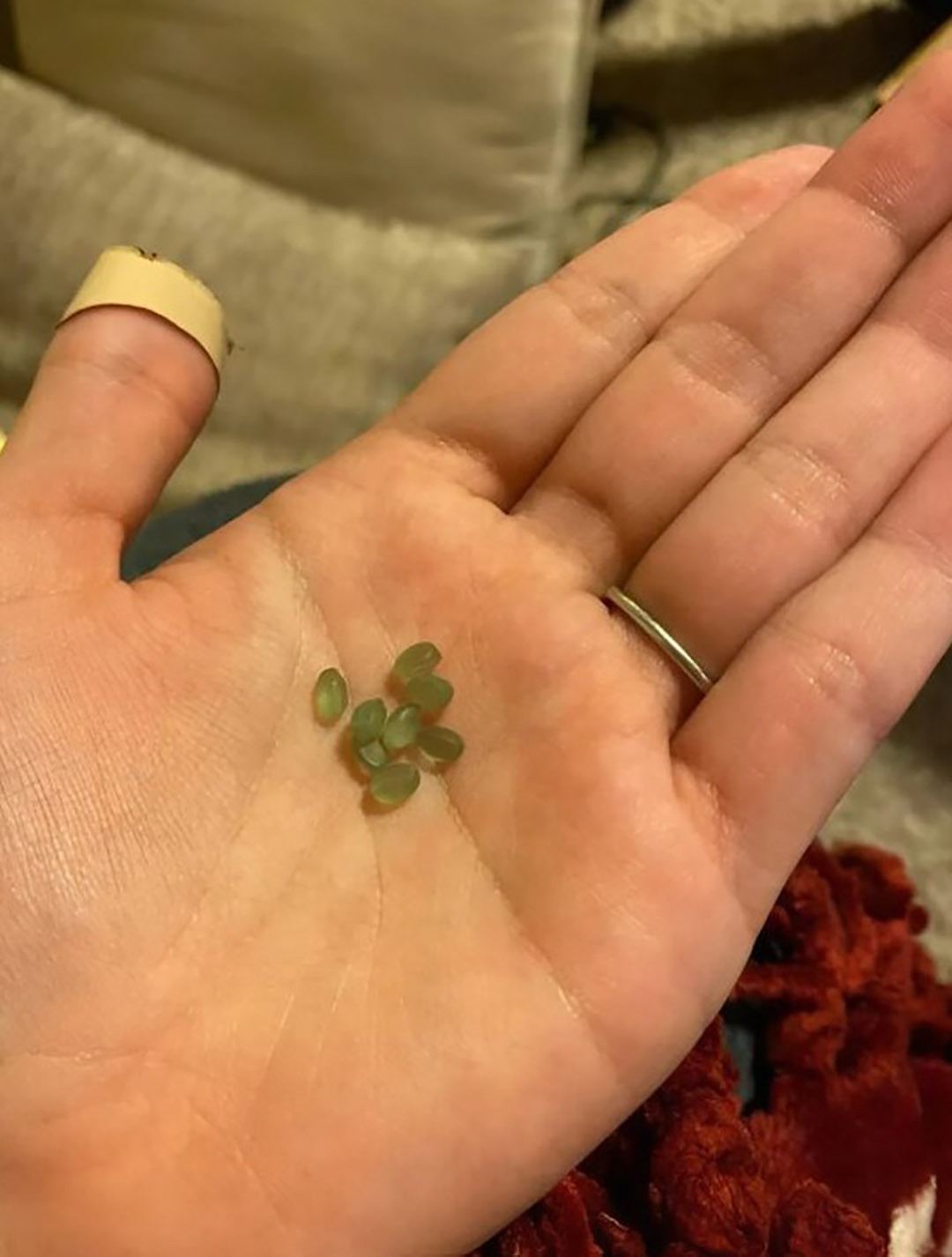 Jeg kjøpte toalettpapir, og det hadde små grønne kuler i seg som så slik ut: Er det noen som vet hva det er?