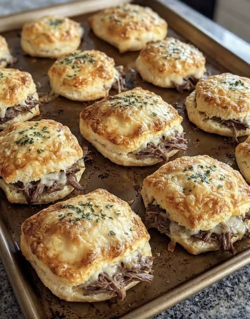 Disse enkle minikjeksene til fingermat tilbyr alle smakene til en tradisjonell fransk dippsandwich: saftig roastbiff, smeltet ost og rik kjøttsaft, alt pakket inn i en flakete, smøraktig kjeks.