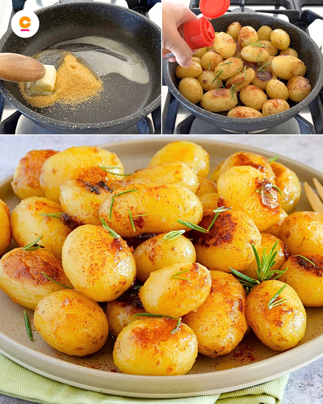 Pannestekt karamelliserte fingerpoteter er en original og smakfull tilbehørsrett som er klar på bare noen minutter. Fingerpoteter, kokt i kokende vann fra kaldt vann og skrelt mens de fortsatt er varme, lar de karamellisere hele i en stor kjele med en base av smør og brunt sukker.